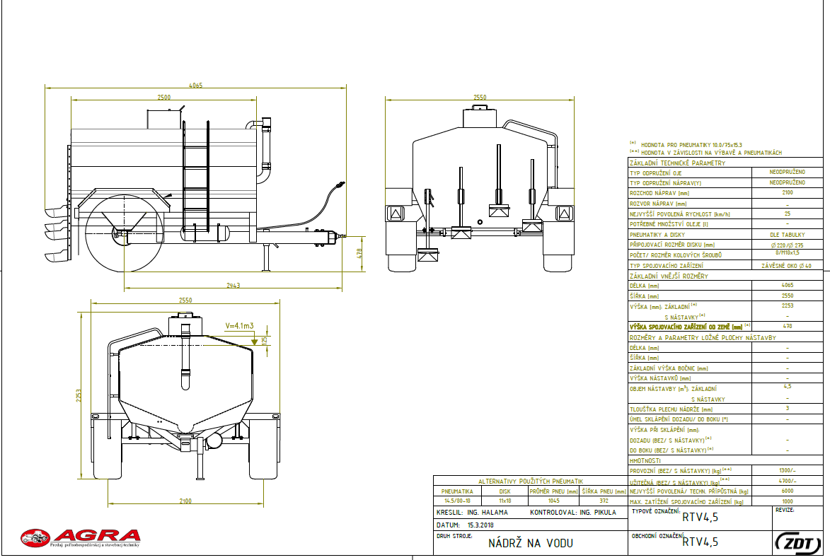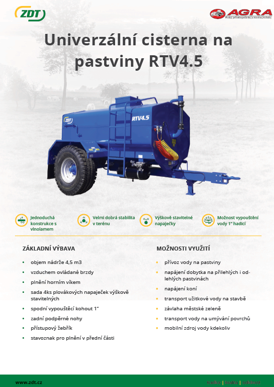 Cisterna je vybavená pevnou nápravou a ponúka kapacitu 4,5 m3 vody. Je vyrobená z oceľového plechu, povrchovo ošetreným vnútorným aj vonkajším lakovaním. Napájačky je možné výškovo nastaviť a prispôsobiť pre rôzne zvieratá. V zadnej časti stroja sa tiež nachádzajú oporné noh zabraňujúce prevrhnutiu stroja smerom dozadu. Cisterna je dostupná v jednej veľkostnej i výbavovej verzii.