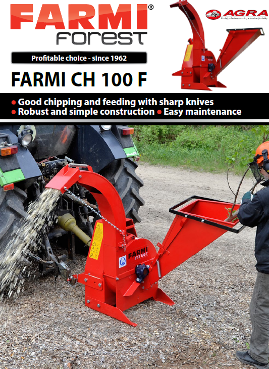 Štiepkovače FARMI CH 100 F sú vhodné pre malotraktory využiteľné v záhradách, v parkoch a na okrajoch ciest. Dva sekacie nože a jeden protinôž sú konštruované pre aktívne vťahovanie konárov až do priemeru 10 cm.