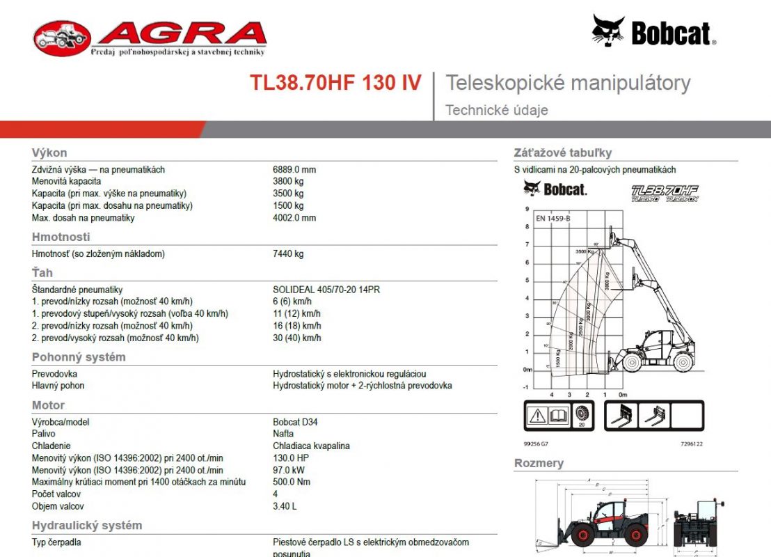 Teleskopický manipulátor Bobcat TL38.70 HF vďaka svojim parametrom je špičkou vo svojej triede. Môže zdvíhať až 3,8 tony do výšky takmer 7,0 m. Patentovaná asymetrická kabína ponúka úplnú panoramatickú viditeľnosť, ktorá je nevyhnutná pre bezpečnú a pohodlnú prácu.